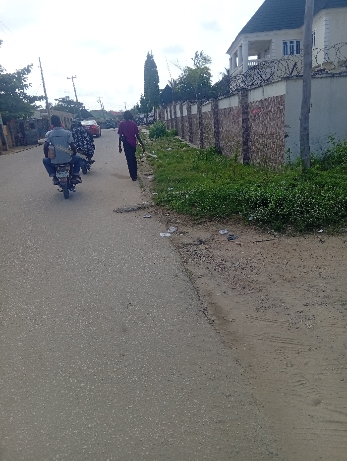 This image captures a street scene in Lokoja, Nigeria, under an overcast sky. A paved asphalt road extends into the distance, bordered on the right by an unpaved dirt shoulder with scattered green vegetation and various pieces of litter. Along the right side of the road, a tall, multi-sectioned perimeter wall, featuring brown rectangular tiling on its lower half and a light-colored upper section, is topped with multiple strands of razor wire. Behind this wall, a two-story residential building with a light-colored facade, white columns, and a dark-tiled hip roof is visible. Three individuals are present, moving away from the viewer. On the right, a male subject in a purple shirt and dark trousers walks parallel to the perimeter wall. On the left side of the road, two male subjects are riding motorcycles in tandem. The lead motorcyclist wears a light-colored shirt and dark trousers, with a light-colored bag slung over his left shoulder. The second motorcyclist, following closely, wears a patterned shirt and dark trousers. Further down the road, a red sedan is partially visible behind the motorcycles. Wooden utility poles and overhead lines are present along the left side of the road, extending into the background.