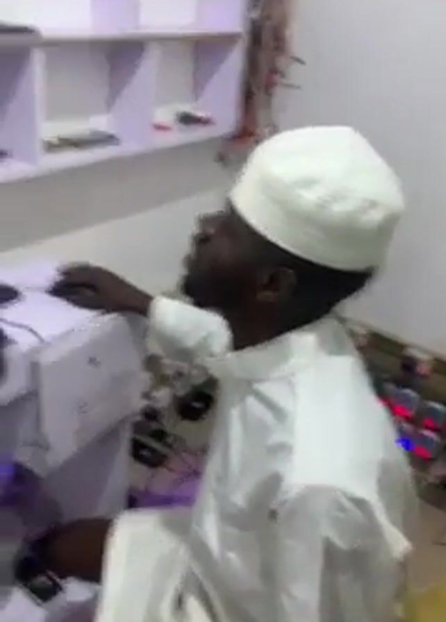 A man wearing a white Muslim skull cap and a white traditional gown is seated in front of a desktop computer. He is operating the mouse with his right hand, and the monitor displays a Windows desktop with various icons. The computer setup includes a black keyboard and a Dell desktop unit. There is a light-purple shelf behind the desk, containing miscellaneous items. Wires and plugs are visible on the floor around the desk. Music plays in the background.