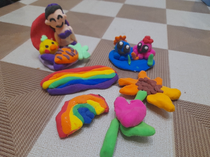The scene depicts multiple colorful, handcrafted clay figures arranged on a checkered tabletop in Yerevan, Armenia. From bottom-left to bottom-right, the figures include: * A pink heart with two green leaves and a green stem. * A partial rainbow arc displaying red, orange, yellow, green, and blue stripes. * A sunflower-like object with a textured brown center and six yellow-orange petals. Moving towards the top, from left to right: * An elongated rainbow-shaped object with distinct stripes of red, orange, yellow, green, blue, indigo, and violet. * A blue base supporting two small, stylized figures: one blue and one pink/red, both with black and white eyes and small orange/red protrusions on their heads. * A larger composition featuring a smiling figure with black hair, wearing a purple top, seated on a red base. Next to it are a yellow chick-like figure and an orange-brown object with purple markings, possibly an animal or a shell. This entire group rests on a light purple base with a green leaf shape. The objects are placed on a surface with a checkerboard pattern composed of alternating light beige and light brown squares, each possessing a subtle textured finish. The lighting is uniform. No individuals are present in the image.