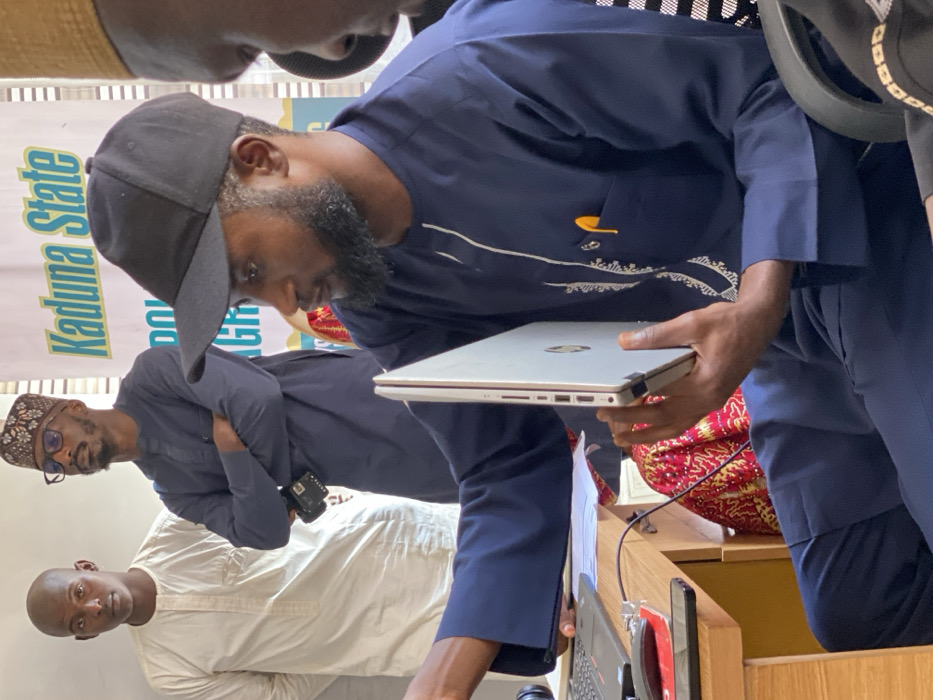 The image captures an indoor scene in Unguwar Rimi, Nigeria, featuring four adult males. In the foreground, a man with a dark beard and a black baseball cap, dressed in a dark blue embroidered tunic and trousers, is seated. He holds a silver HP laptop vertically in his left hand, while his right index finger points towards a light-colored wooden desk. On the desk, a dark grey laptop, a red peripheral, and a black smartphone are visible. In the mid-ground, two men stand behind the desk. The man on the left has a bald head, wears a cream-colored tunic, and stands with his hands clasped behind his back. The man in the center wears glasses and a patterned cap, a dark blue embroidered tunic, and holds a black camera in his crossed arms. A fourth man is partially visible on the far right. A banner displaying the text "Kaduna State" in blue font is mounted on the wall in the background, above a red and gold patterned fabric.