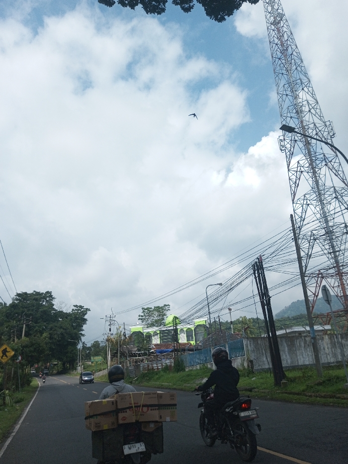 A road scene features two motorcycles. The first motorcycle carries stacked boxes strapped to its back. The second motorcycle rider is visible. In the background, a building with a light green facade and a dome stands out amidst greenery. A tall communication tower stretches into the cloudy sky. Overhead, numerous electrical wires crisscross. A bird flies in the upper portion of the frame. A car is visible farther down the road.