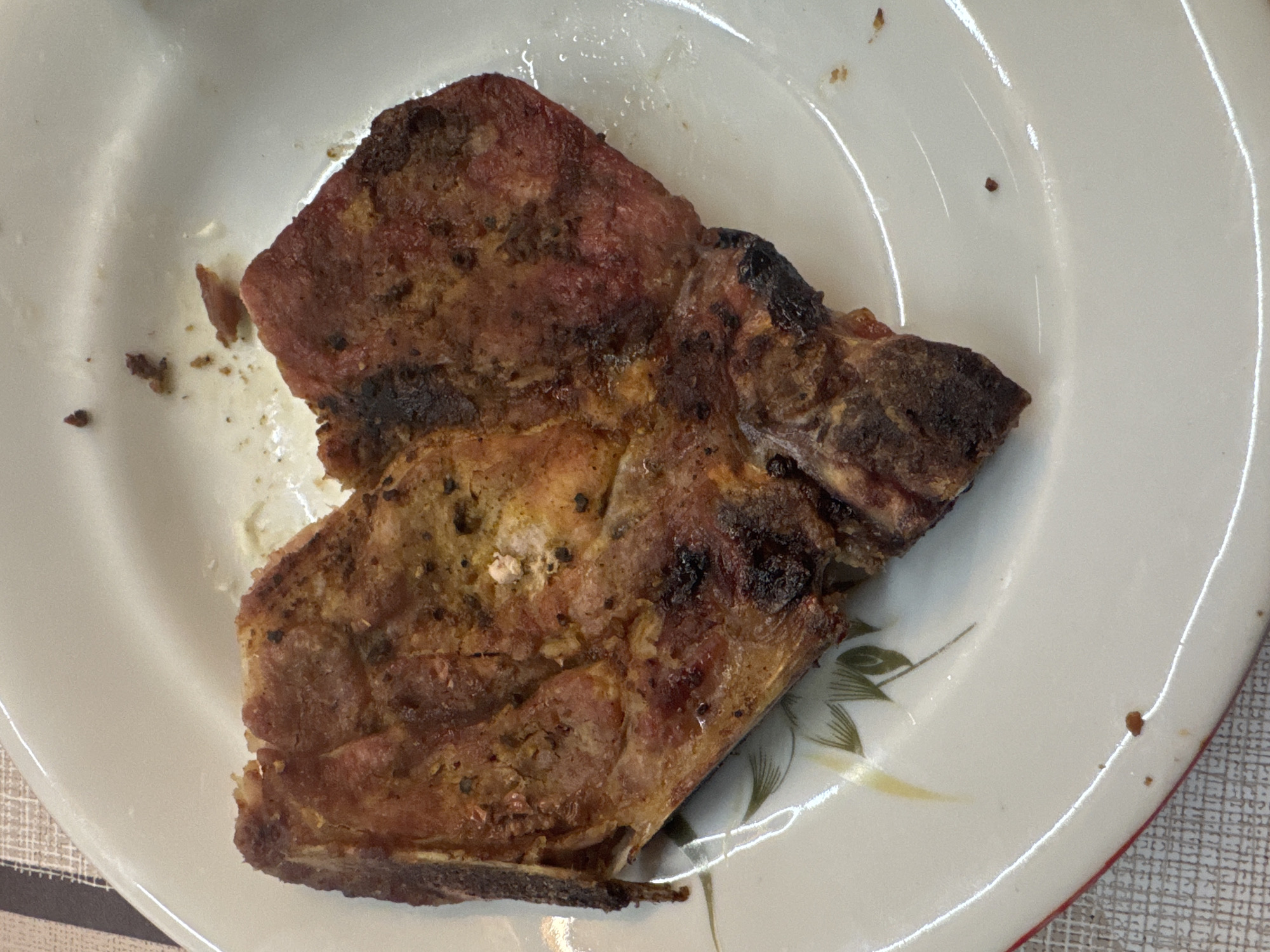 - "cooked pork chop on a white plate with a floral pattern" by FM-4DPtd2, licensed under CC BY 4.0