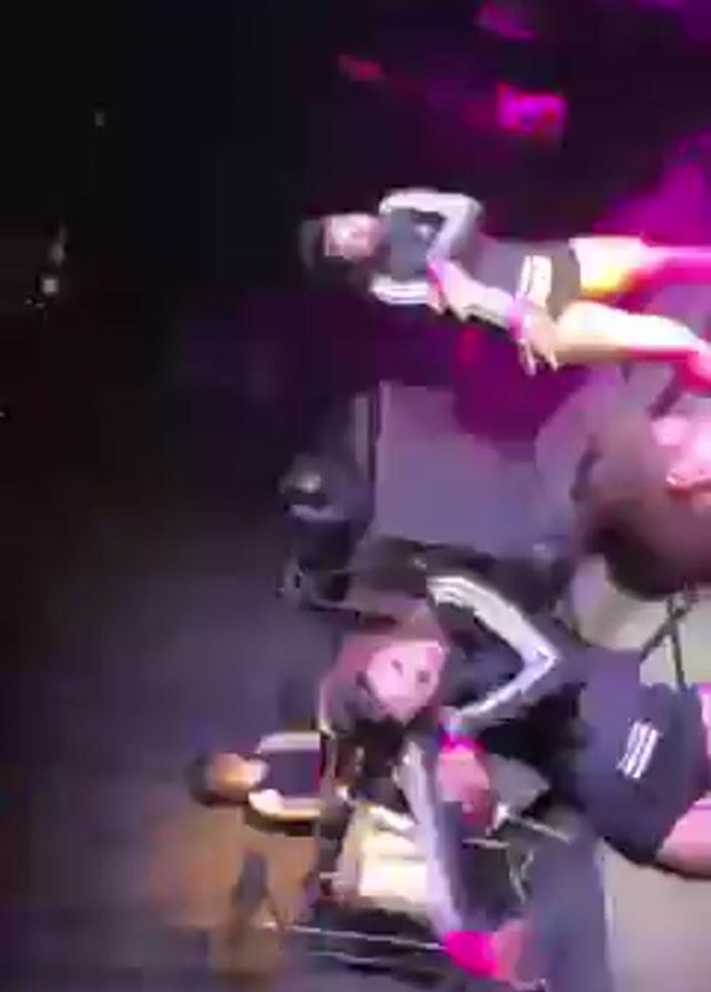 A performer in a short black top with green accents and camouflage pants dances on stage. The person has long, dark hair and is surrounded by people taking photos with their phones. Purple spotlights illuminate the stage.
