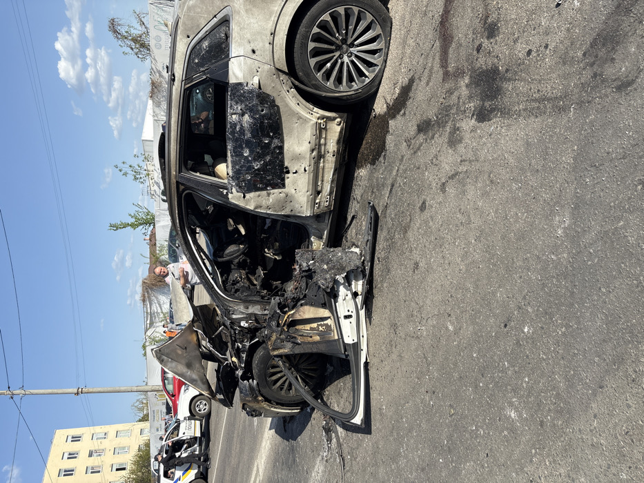 burned-out, silver SUV in a street in Kharkiv, Ukraine