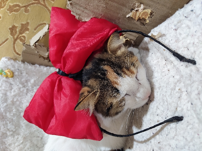 A calico domestic cat is depicted resting on a white, textured surface. Its eyes are closed. A red fabric headband featuring a large red bow is positioned on the cat's head, with black elastic bands extending onto the white surface. The cat's fur coloration includes white, brown, and black patches. To the upper left, a small yellow and green object is partially visible against the white textured material. To the right, torn brown corrugated cardboard is present, positioned in front of a light-colored wall or surface featuring a darker, organic pattern. The scene is located in the city of Harasta, Syria.