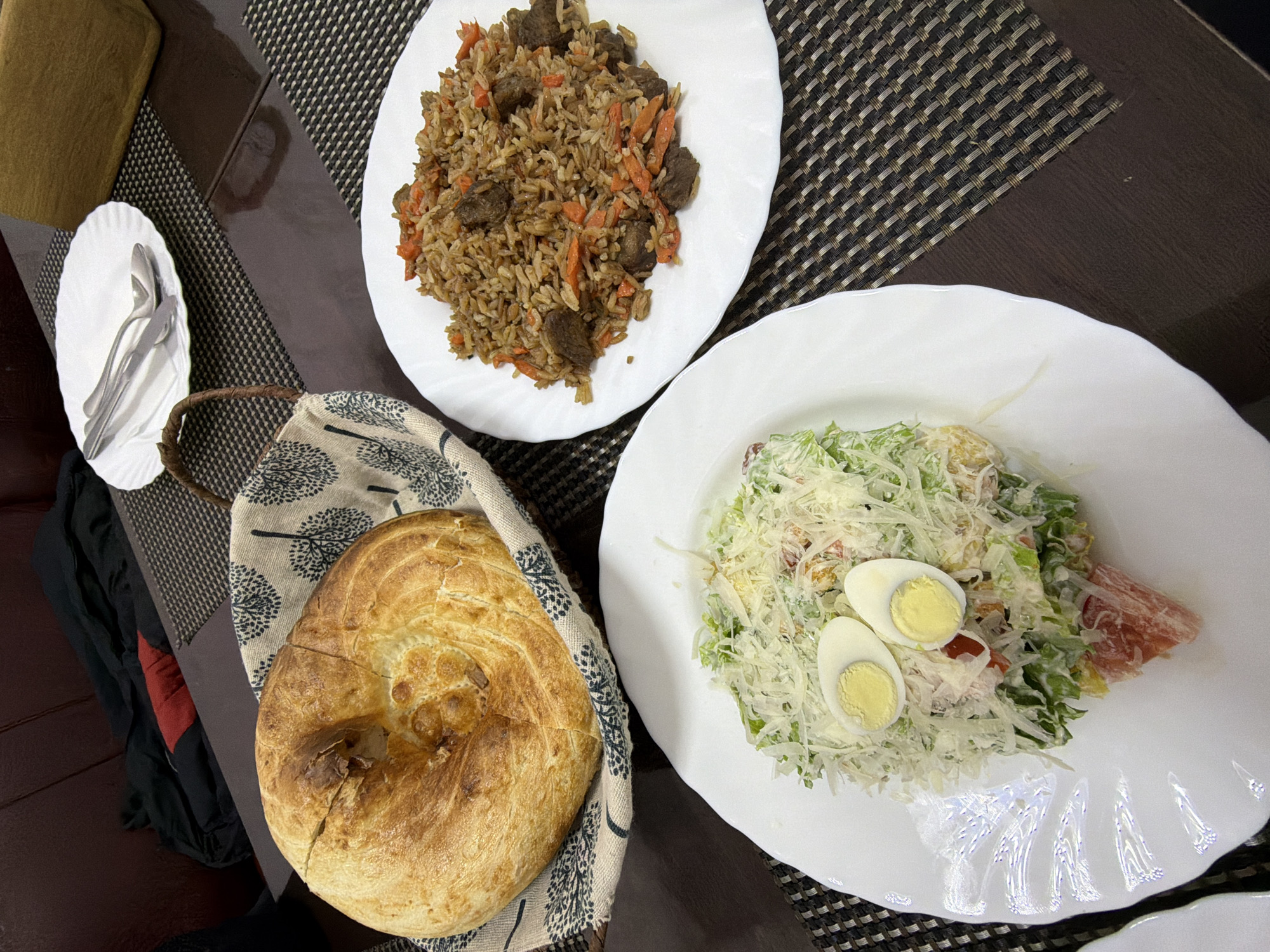 The image presents a tabletop scene with an assortment of food dishes arranged on a patterned placemat. A plate of plov, a rice dish with meat and carrots, is prominently featured. Beside it, a basket cradles a round loaf of bread. Additionally, there is a plate of salad topped with what appears to be grated cheese and two halved boiled eggs. Silverware rests on a small white plate nearby. The specific location, Nizhnevartovsk, Russia, cannot be verified from the visual information provided in the image.
