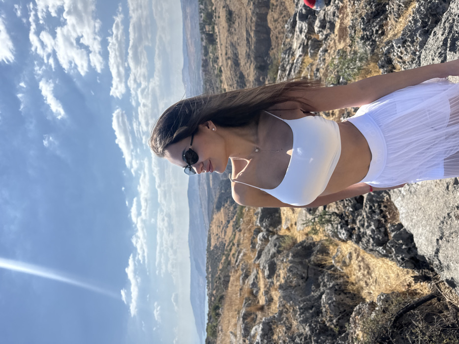 A young adult female is depicted outdoors on a bright, sunny day, standing on rocky, arid terrain. She is positioned slightly right of center, looking towards the left side of the frame with a subtle smile, her profile visible. Her long, dark brown hair is windswept, and she wears dark oval sunglasses. She is dressed in a white spaghetti-strap crop top, revealing her midriff, and a white sheer pleated mini-skirt worn over white shorts. A delicate silver-colored necklace and a small white stud earring are visible, as is a thin red bracelet on her left wrist. The environment features a clear blue sky with scattered white cumulus clouds; a prominent sunbeam or lens flare emanates from the upper left. The immediate foreground and midground consist of light-colored rocky outcrops and dry, yellowish-brown vegetation. Beyond this, the terrain slopes downwards into a valley or ravine, leading to a large body of water, identifiable as the Sea of Galilee, with hazy mountains in the distant background. A small red object, possibly a hat or part of clothing, belonging to another partially obscured individual, is visible at the far right edge of the image. The scene is consistent with a location within the Emek HaYarden Regional Council, Israel, specifically overlooking the Sea of Galilee from an elevated position.