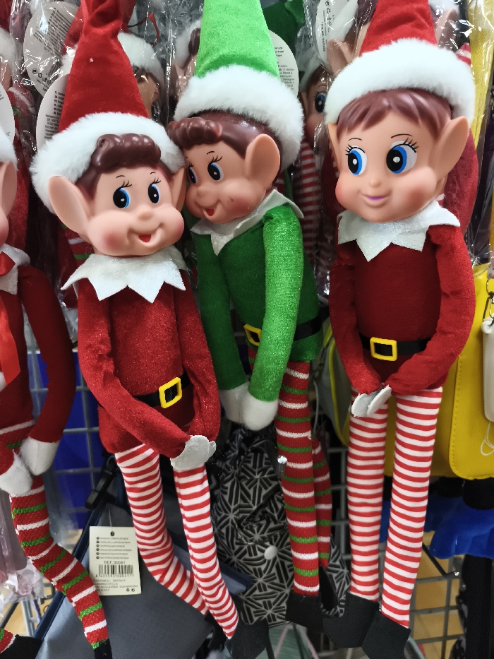 - "The image depicts three plastic-faced elf dolls arranged vertically in a retail display, consistent with a store environment in Moguer, Spain" by FM-CDK0s2, licensed under CC BY 4.0