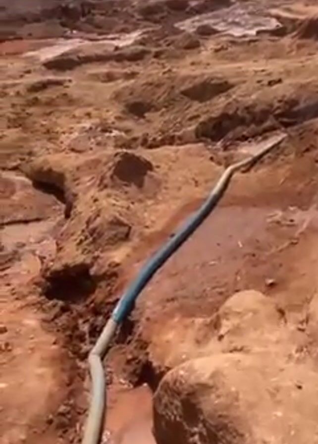 large area of reddish-brown dirt that appears to have been dug up. A blue pipe runs through the scene, crossing over the uneven terrain. There are small puddles of water in the dug-up areas. In the distance, several people are working in the muddy landscape. There are some buildings visible in the background, suggesting the location is a settlement or village.