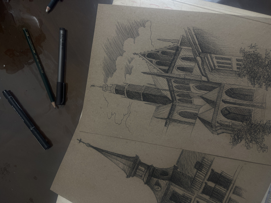 The image displays an open sketchbook with light brown paper, positioned on a dark, reflective surface, likely a table, within an indoor setting in Vagharshapat, Armenia. The sketchbook contains two detailed architectural drawings executed in dark ink or pencil using line art and cross-hatching. On the left page, a vertical sketch depicts the upper portion of a building, featuring a pointed spire topped with a cross, a clock face, and a balcony. On the right page, a larger sketch portrays a gothic-style church or cathedral, viewed from a low angle. This drawing includes multiple arched windows, prominent spires, and a cross atop the central spire, with hatched clouds in the background and scribbled foliage at the base of the structure. Adjacent to the top edge of the sketchbook, several drawing instruments are scattered on the dark surface: a black fineliner pen (Pigma Micron 0.1), a dark green Faber-Castell 9000 2B pencil, a dark grey PENSAN 9000 marker, and a partially visible light-colored pencil. The dark surface exhibits subtle reflections and minor surface marks. No individuals are present in the scene.