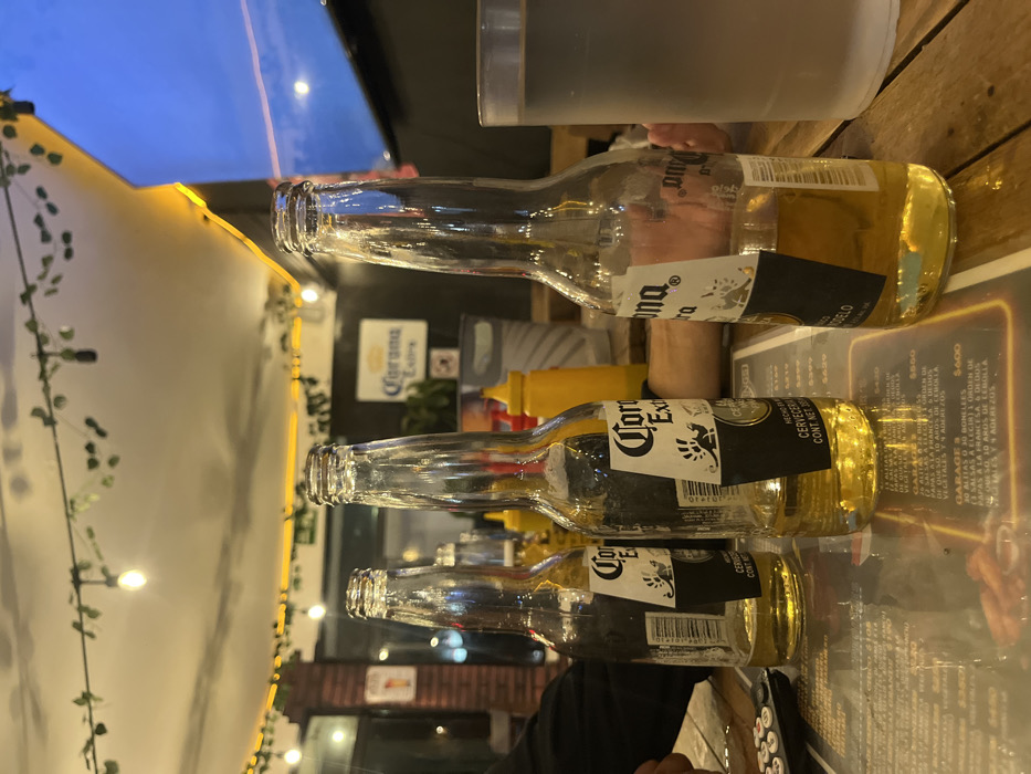 Three Corona Extra beer bottles, partially consumed, lie on a reflective surface. The topmost bottle has the least amount of beer remaining. A cooler and condiment bottles are in the background. String lights adorn the outdoor space, visible on the left side. A television screen displays the sky above. The reflective surface shows a menu underneath.