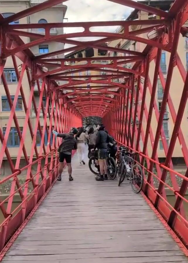 group of people and bikes on a red iron bridge