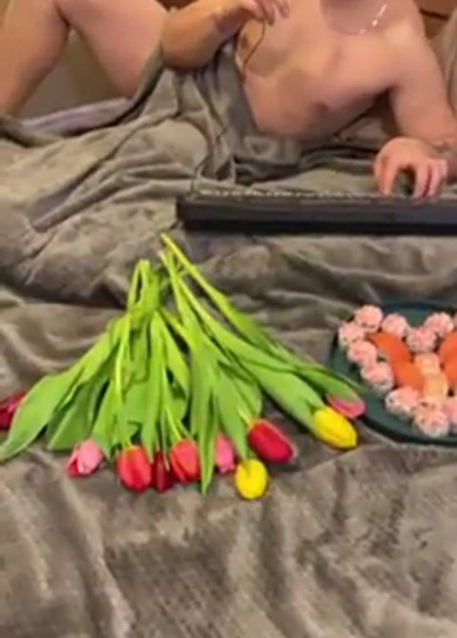 A fair-skinned man is filmed from the waist up, reclining in bed and playing a keyboard. He is wearing red sunglasses and a thin silver necklace. He is partially covered by a gray blanket and is shirtless. He holds a small microphone in his hand. Next to the keyboard lie a bouquet of colorful tulips, and a plate of sushi arranged in the shape of a heart.