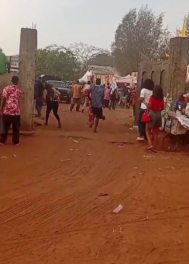 group of people walking through a dirt road towards an area with tents and crowds. A man in a striped shirt and shorts is running towards the crowd. A car is parked on the left side of the road. The ground is red dirt. The sky is overcast. There are trees in the background. There are concrete gate pillars at the entrance to the area.