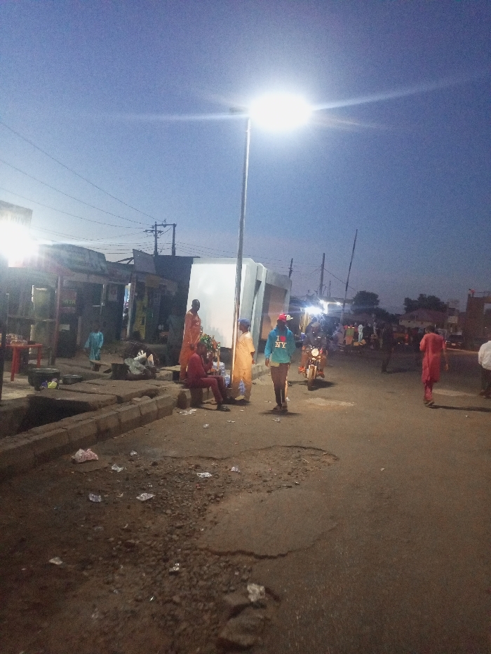 This image depicts a bustling street scene at night in the city of Jos, Nigeria. A prominent, brightly illuminated street light on a tall pole stands near the center of the frame, casting a strong glare and illuminating the immediate area. The sky above is a deep blue, indicative of evening or very early morning. On the left side of the paved road, a concrete curb and open gutter separate the street from a row of informal commercial structures or shops. These buildings are dimly lit, with some showing corrugated metal roofing. A small red table and other indeterminate objects are visible near the leftmost shop. Several individuals are present: * Near the shops on the left, a person in a dark red garment is seated on a low concrete structure. * Standing close by are two individuals, one in a light brown garment and another in an orange-brown traditional attire. * A small child in a light blue outfit is visible further left, near the shops. * In the midground, a person wearing a light blue hoodie with "I ❤️ NY" printed on it and a red cap walks towards the right. * Further down the street on the right, another person in a red traditional garment walks away from the viewer. * A motorcycle with a rider is visible in the midground, its headlight on, moving away from the viewer. * Several other figures are discernible in the darker background, indicating additional pedestrian activity. The asphalt road surface shows significant wear, with numerous potholes and uneven patches visible, particularly in the foreground. Scattered litter, including plastic bags and debris, is present on the road and near the curb. Power lines and utility poles are visible against the sky in the background.