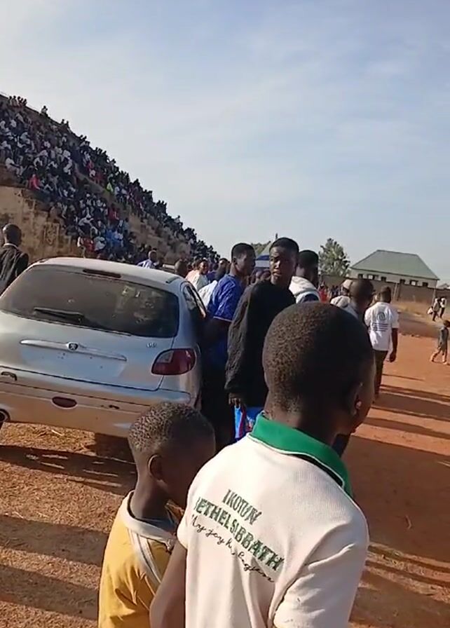 The scene appears to be outdoors, possibly at a sports event or gathering near a stadium with a packed crowd in the stands. The ground is a reddish-brown dirt. In the foreground, there are several people, including two children. One child wears a yellow and black striped shirt, while the other wears a white shirt with green trim and the words "IKOTUN BETHEL SABBATH My Joy has begun" printed on the back. Behind them, a group of people is milling around. There is a silver-colored car parked nearby, its rear visible. The sky is a pale blue, suggesting it is daytime. The overall atmosphere seems to be one of anticipation or excitement, given the crowd and the informal nature of the gathering.