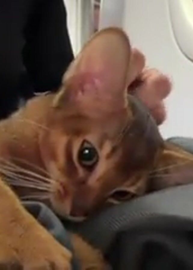 A person in a black top pets a ginger cat lying on a gray blanket in an airplane seat. The cat has its eyes closed and appears relaxed. An airplane window is visible in the background.