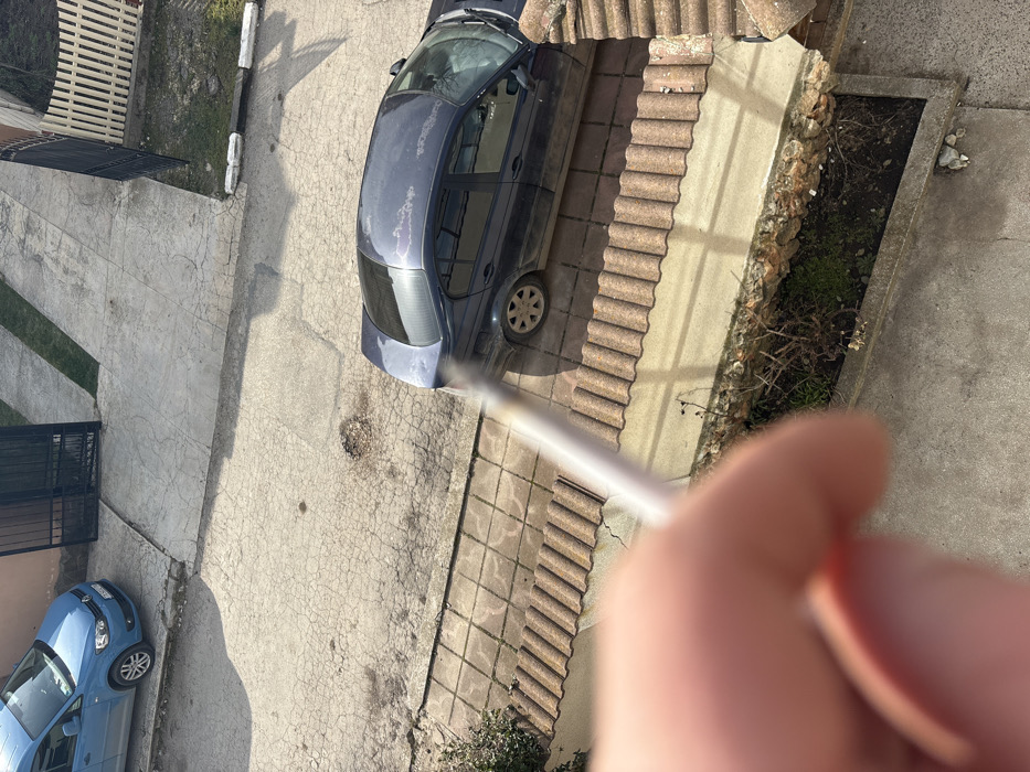 The image depicts an elevated view of an outdoor scene, reported to be in Stefan Karadja, Bulgaria. In the immediate foreground, a blurred human hand extends from the lower-left, holding a white, unfiltered cigarette. Below the hand, a residential street or driveway of cracked and weathered grey concrete pavement features several small potholes. Two vehicles are present: To the upper left, a light blue Volkswagen Polo sedan is parked, angled slightly left, displaying a partial license plate with a "PB" designation. To the lower right, a dark blue BMW 3 Series sedan is parked, angled slightly right; its roof and trunk lid show extensive paint deterioration and fading. The street is bordered by several features: A dark grey metal gate is visible in the upper-left, partially open. Another dark grey metal gate is seen in the upper-right, leading to a grassy strip and a white picket fence. A concrete curb with intermittent white paint markings runs along the edge of the pavement. Below the cars, a tiled parapet or ledge with terracotta-colored tiles extends horizontally across the frame. Beneath this structure, a narrow garden bed contains sparse, dry vegetation and exposed soil. The scene is illuminated by direct sunlight, casting distinct shadows onto the pavement.