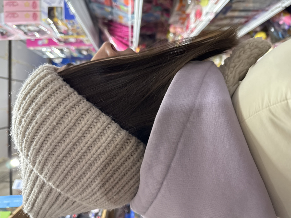 The image is of a woman's head and shoulders taken from an upward angle. She wears a tan knitted beanie hat that covers the top of her head, revealing straight, dark brown hair. She's wearing a light purple hoodie that rests against a white, puffy jacket or garment. The background features blurred retail shelves stocked with colorful products, suggesting she's in a store.
