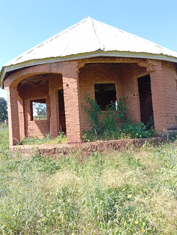 This image depicts an unfinished or derelict, single-story, octagonal-shaped building located in Madakiya, Nigeria
