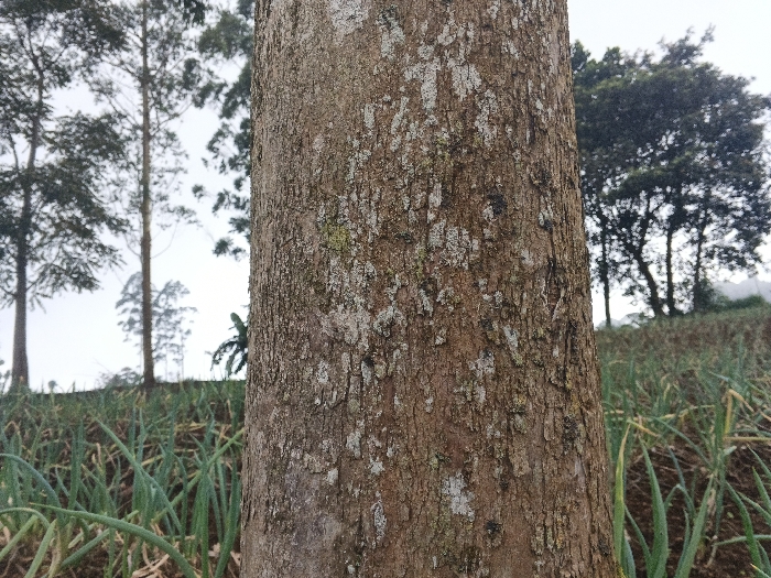 - "The image displays a close-up of a brown tree trunk dominating the central foreground, exhibiting textured bark with vertical fissures and patches of white, grey, and green lichen" by FM-oQXKA3, licensed under CC BY 4.0