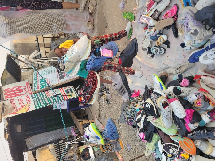 A man in a yellow shirt and plaid pants sits among a large pile of shoes. Many of the shoes are sneakers, and they are strewn across a white tarp. Some shoes are hanging on a line. Several signs are visible, advertising services and registration. The scene appears to be an outdoor marketplace.