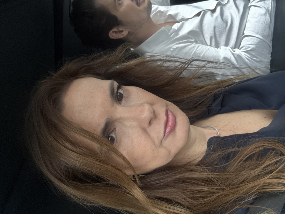 This image depicts two individuals situated in a dark, enclosed environment, likely the interior of a vehicle. The specific location within the city of Loures, Portugal, is not discernible from the visual information. In the foreground, a female subject, estimated to be in her 40s-50s, occupies the left side of the frame. She possesses fair skin, long reddish-brown hair parted on her left, and dark brown eyes directed at the viewer. She wears a dark collared shirt, unbuttoned at the neckline, revealing a thin silver-colored chain necklace. A dark earring is visible on her left ear. Her expression is neutral. To her right and slightly behind her, a male subject, estimated to be in his 20s-30s, is partially visible. He has dark hair and fair skin, and wears a white collared shirt, unbuttoned at the top. His head is turned to the right, looking away from the camera, with his mouth slightly ajar. Only the right profile of his face and a portion of his upper torso are discernible. No direct interaction between the subjects or with the camera is evident from the male's posture. The background is uniformly dark and out of focus, offering no identifying features of the environment.