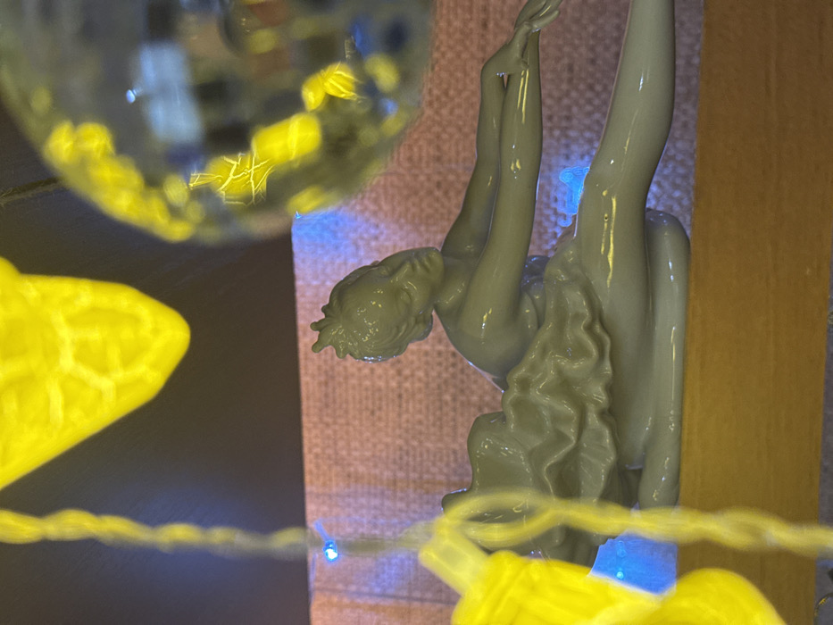 A ceramic statue of a woman with flowing hair rests on a woven pink surface next to a wooden board. Her arms are raised above her head, and her legs are crossed. A disco ball and yellow lights frame the left side of the image, casting a reflective glow. The statue is illuminated by blue light at its base.