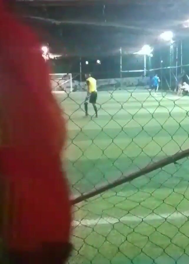 At night, a fenced-in soccer field is seen with multiple people playing. The field is covered in artificial turf and well-lit by overhead lights. A net fence surrounds the field. The camera is positioned outside the fence, looking in. In the foreground, the back of a person wearing a brown shirt is visible on the left, partially obscuring the view. Another person wearing a shirt with white and red accents walks in front of the camera on the right side of the frame. On the field, several people are engaged in a soccer match, with one player wearing a yellow shirt being a prominent focus. Other players wear blue or dark-colored clothing. A soccer goal is seen at the far end of the field.
