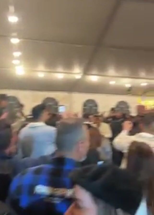 large crowd of people dancing and mingling inside a white tent structure, illuminated by rows of overhead lights. Many people are holding and looking at their phones. The environment suggests a festive event, possibly a wedding or celebration. A speaker is visible on the edge of the shot. People are wearing a variety of clothing, including jackets, patterned shirts, and casual attire. The overall atmosphere appears lively and social.