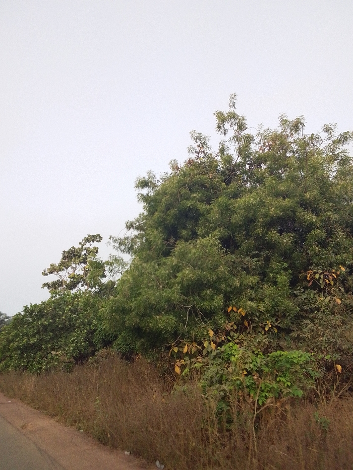 This image depicts a roadside view in Emabo, Nigeria, characterized by dense vegetation under an overcast sky