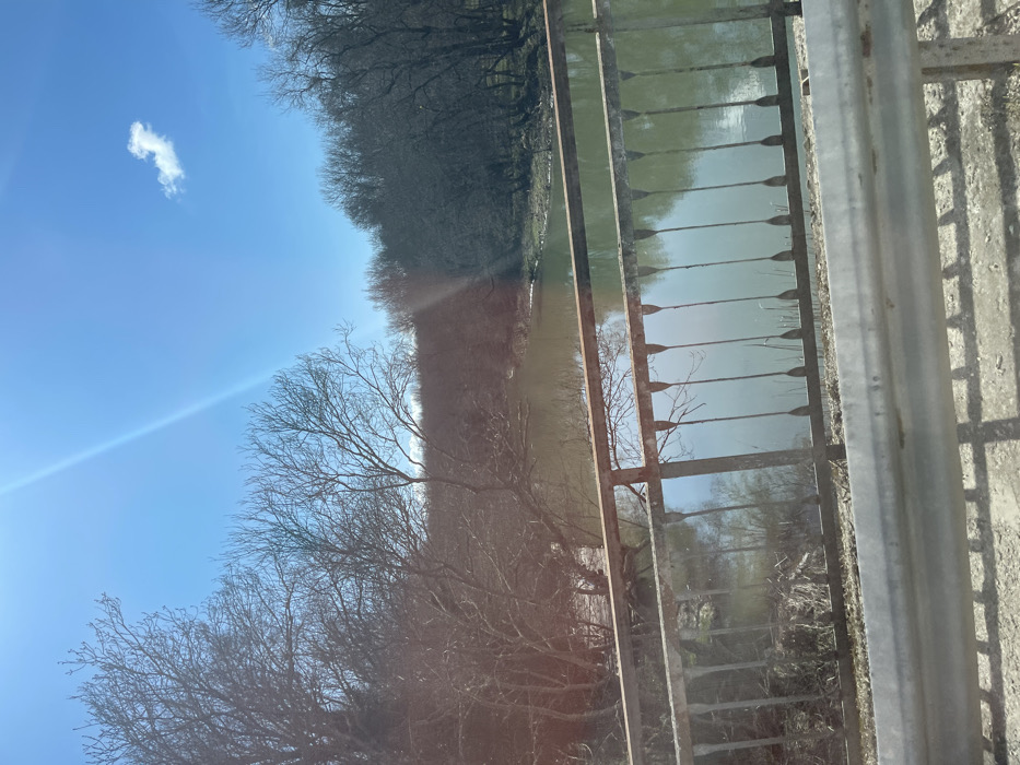 The scene depicts a view from a bridge over a river in Primorsko, Bulgaria, under a clear, bright blue sky. The upper left features a prominent diagonal sun glare. A single small white cloud is visible in the upper right sky. Both banks of the river are densely covered with deciduous trees, characterized by bare branches, suggesting late winter or early spring. The river itself is calm, reflecting the sky and surrounding trees, and appears a greenish-brown hue. In the foreground, an ornate, dark grey metal bridge railing with vertical, paddle-shaped balusters spans the width of the image, showing signs of wear. Below this, a silver-colored metal guardrail is partially visible at the very bottom, above a shadowed concrete or paved surface. No individuals or active subjects are present.