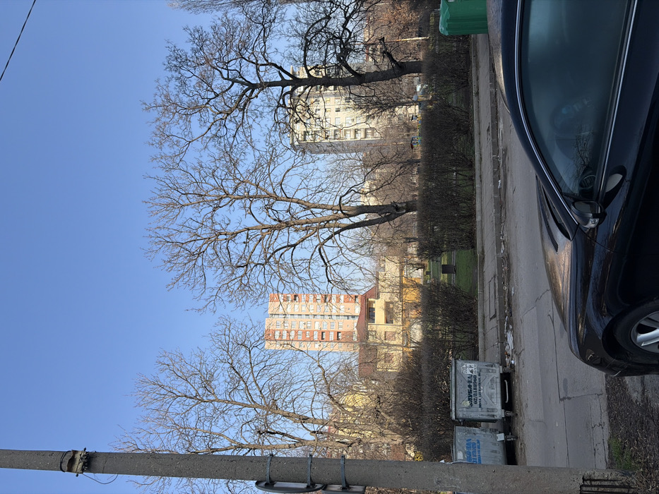 The image depicts an urban residential area in Sofia, Bulgaria, under a clear blue sky. In the foreground, a black sedan, consistent with a Mercedes-Benz, is parked or stopped on a paved street, presenting a frosted or condensed driver's side window. To the left, a gray concrete utility pole rises vertically, displaying some attached wiring and a circular fixture. Adjacent to the street, two gray, rectangular metal dumpsters with wheels are positioned on a sidewalk, displaying Cyrillic text including "ЖИВОТ-ЕА" and phone numbers; refuse is scattered around them. Beyond the street, a park-like green space is visible, characterized by manicured shrubs, patches of dry grass, and numerous bare deciduous trees. In the mid-ground, an older, yellowish building with a red tiled roof is situated. The background is dominated by two distinct multi-story residential blocks: one on the left with an orange-red and beige facade, and another on the right with a lighter-colored, possibly white or beige facade. Multiple small, dark avian subjects are perched on the bare branches of the central trees. No human subjects are present in the scene.