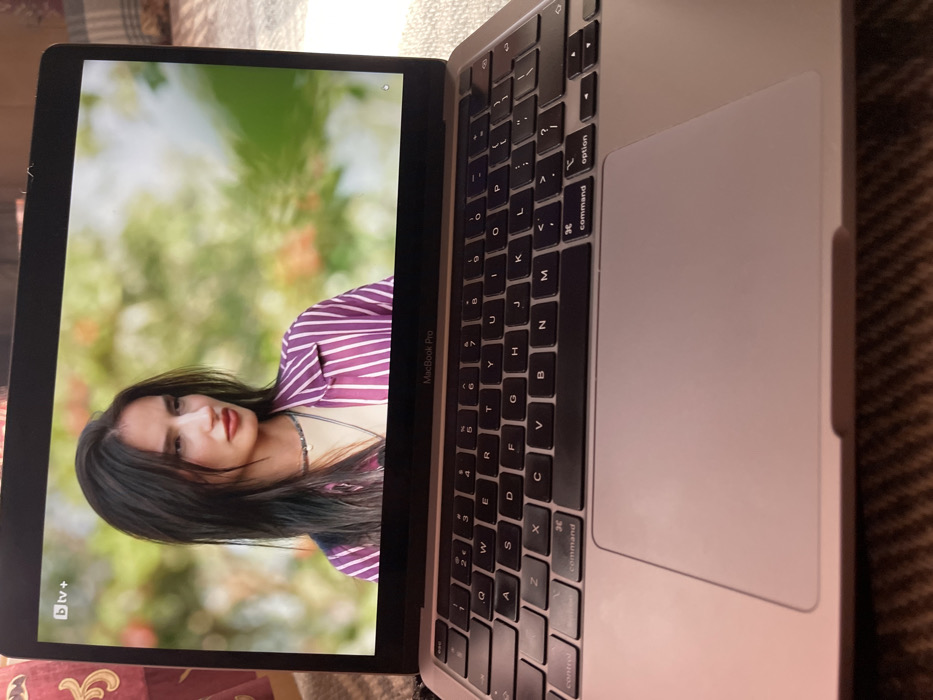 A silver-colored Apple MacBook Pro laptop is depicted, open and resting on a textured, brown, patterned fabric surface. The laptop's screen displays a medium shot of a woman with long, dark hair and fair skin. She wears red lipstick and a delicate necklace over a light-colored top, beneath a purple and white vertically striped collared shirt. Her head is turned slightly to her right, and her gaze is directed off-frame to the right. The background behind the woman on the screen is a blurred outdoor scene featuring green foliage and hints of orange or red blossoms. The "bTV+" logo is visible in the top-left corner of the laptop's screen. The laptop's black keyboard with white lettering and its large silver trackpad are visible in the foreground. Natural light illuminates the scene from the right. The image contains no visual information to confirm the specific location as Lesidren, Bulgaria.