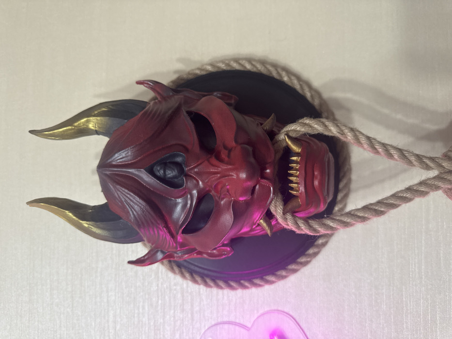 The scene depicts an ornate, dark red Hannya-style mask mounted on a wall in an interior setting in Rostov-on-Don, Russia