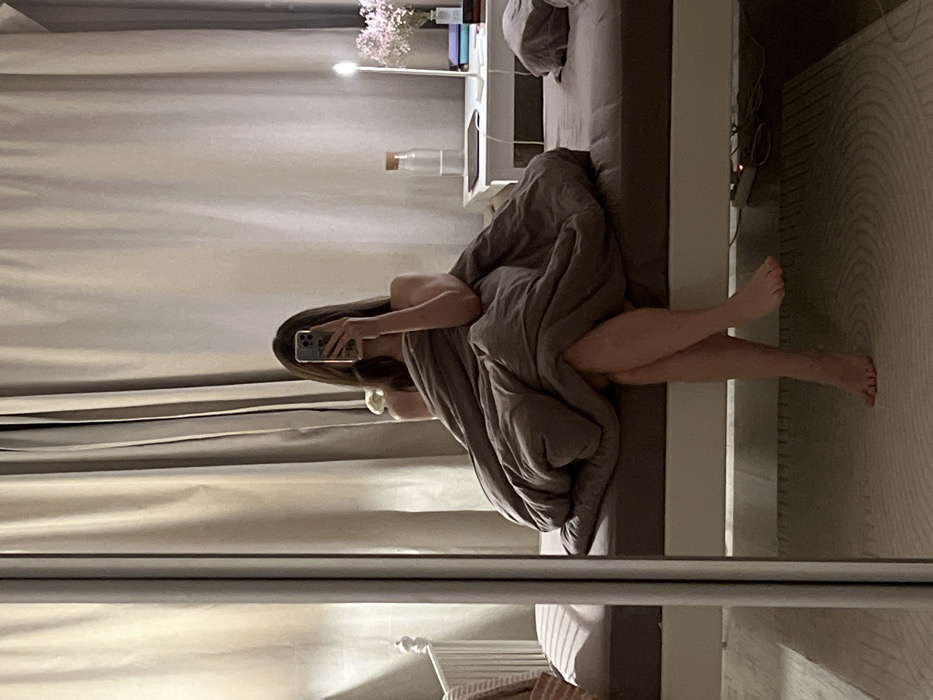 A reflection captures a woman lying in bed under a gray blanket, holding a phone to take a picture. Her legs extend from under the blanket. A bedside table with a lamp, flowers, and a water bottle sits next to the bed. Neutral-toned curtains hang in the background. The reflection is framed by the mirror's edges, with a partial view of a small white table visible at the bottom.