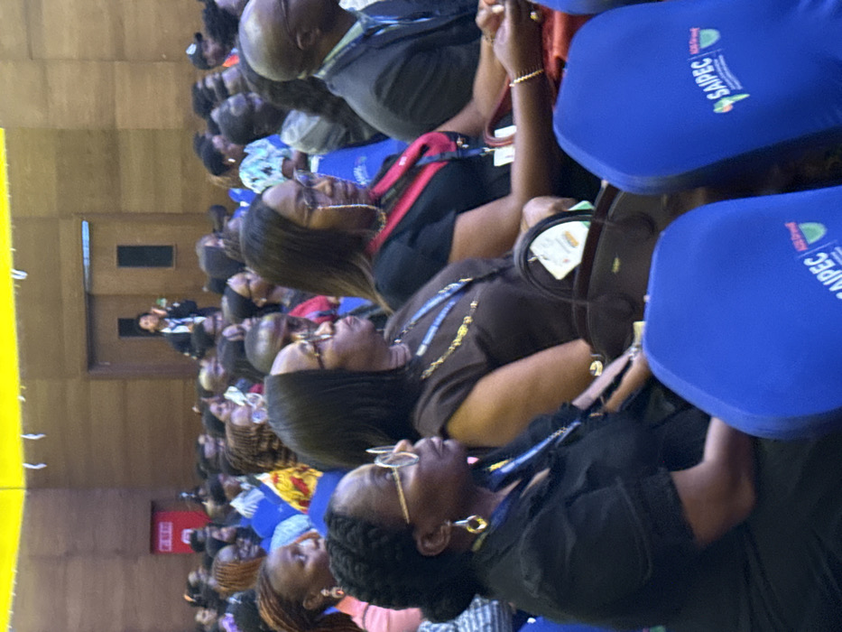 The scene depicts a large indoor conference or event hall in Itirin, Nigeria, filled with numerous attendees. In the immediate foreground, three adult Black women are seated in blue chairs, facing towards the front of the hall, which is out of frame. The leftmost woman wears a dark short-sleeved top, large round gold-rimmed glasses, and gold-colored drop earrings. She has dark, braided hair and a blue lanyard with an ID badge around her neck. The central woman wears a brown sleeveless top, a long gold chain necklace, and dark-rimmed glasses. A blue lanyard with an ID badge is around her neck. A dark brown handbag rests on the chair beside her. Her hair is dark and straight. The rightmost woman wears a black top, glasses with a white beaded chain, and a red lanyard or scarf around her neck. She has several gold-colored bracelets on her left wrist. Her hair is dark and straight. Behind these individuals, rows of additional attendees, predominantly adults of African descent, are visible, also seated and generally facing forward. Some wear lanyards, and a few individuals in the mid-ground wear clothing with vibrant patterns. In the far background, near a light brown wooden wall, a person in a dark jacket is standing, appearing to gesture or observe. The chairs are covered in blue fabric with the white "SAIPEC" logo, featuring a stylized map of Africa and the text "Africa's World," confirming the event's identity. The room features light brown wooden paneling on the walls and a bright yellow ceiling or lighting structure. A red object, possibly a fire alarm or extinguisher, is partially visible on the left wall in the background.