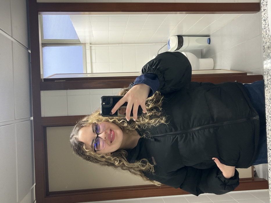 A young woman wearing glasses and a black puffer jacket takes a mirror selfie in a bathroom