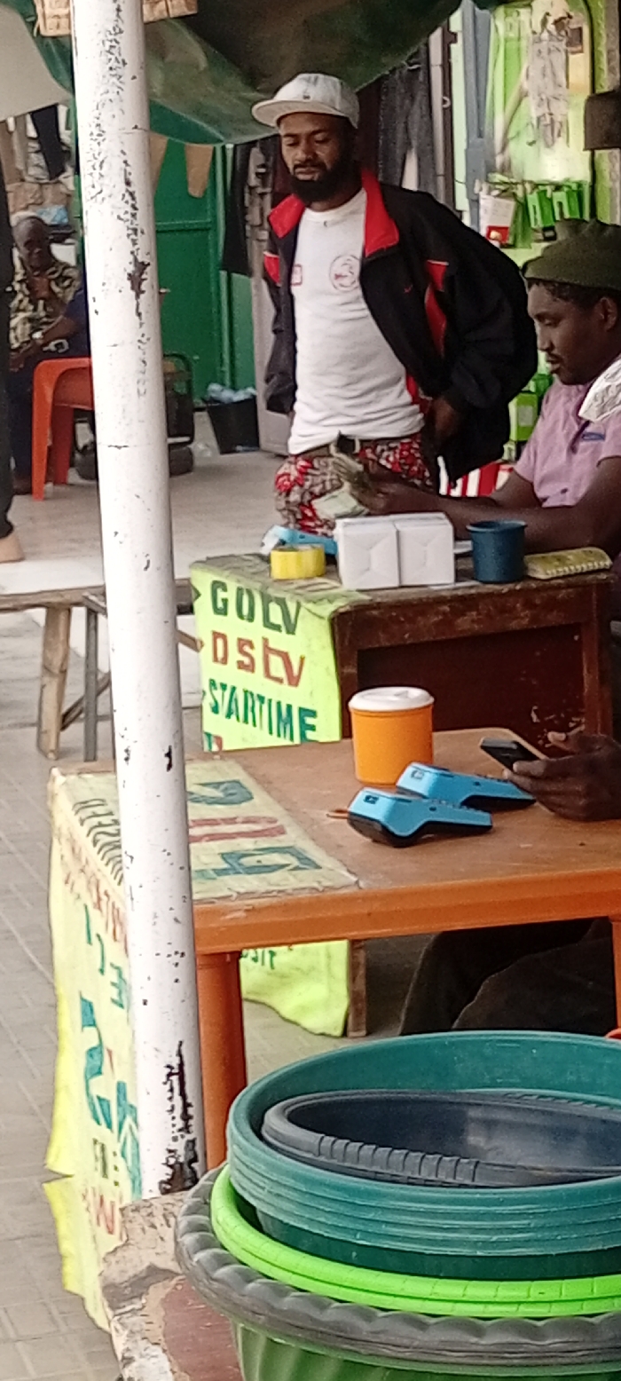The scene depicts an outdoor commercial or service point in Kwachiri, Nigeria. In the foreground, a white, weathered pole stands, partially obscuring a stack of plastic basins or bowls in various shades of green, black, and gray. To the right of the pole, an orange plastic table supports a vibrant yellow and green banner. The banner displays "GOLV," "DStv," and "STARTIME" in green and red lettering, indicating services offered. On the table, two blue point-of-sale (POS) terminals are visible, along with an orange cup with a white lid, a yellow roll of tape, and two small white boxes. A man wearing a pink shirt and a dark green cap is seated behind this table, holding a mobile phone and looking down at it. Standing to the left of the seated man is another man, dressed in a white t-shirt, a black jacket with red trim, white baseball cap, and red-patterned shorts. He holds a stack of cash in his hands and is looking downwards. In the deeper background, another individual wearing a patterned shirt is seated on an orange plastic chair, partially visible. The background also reveals a green awning or tarp overhead, a green wall or doorway, and what appears to be merchandise or clothing hanging. A black bucket is visible on the ground.