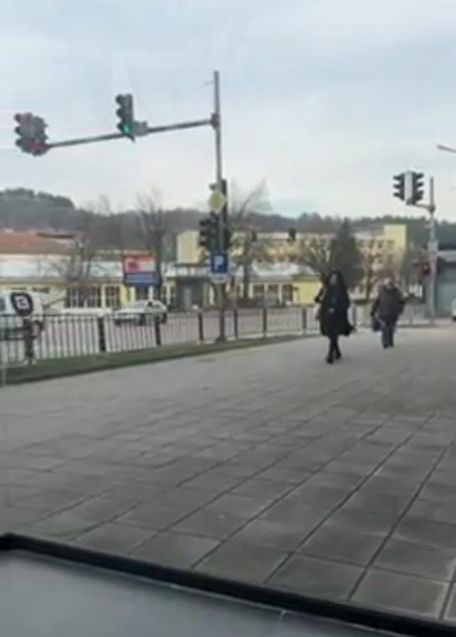 n outdoor scene observed through a clear glass door. Outside, there is a wide, paved sidewalk with a crosswalk where two people are walking. The traffic light is green. Cars are lined up on the street behind a metal railing, with apartment buildings and other structures visible in the background. There are signs and stickers attached to the glass door, partially obscuring the view. A round, glass-topped table is inside, near the door. The sky is overcast.