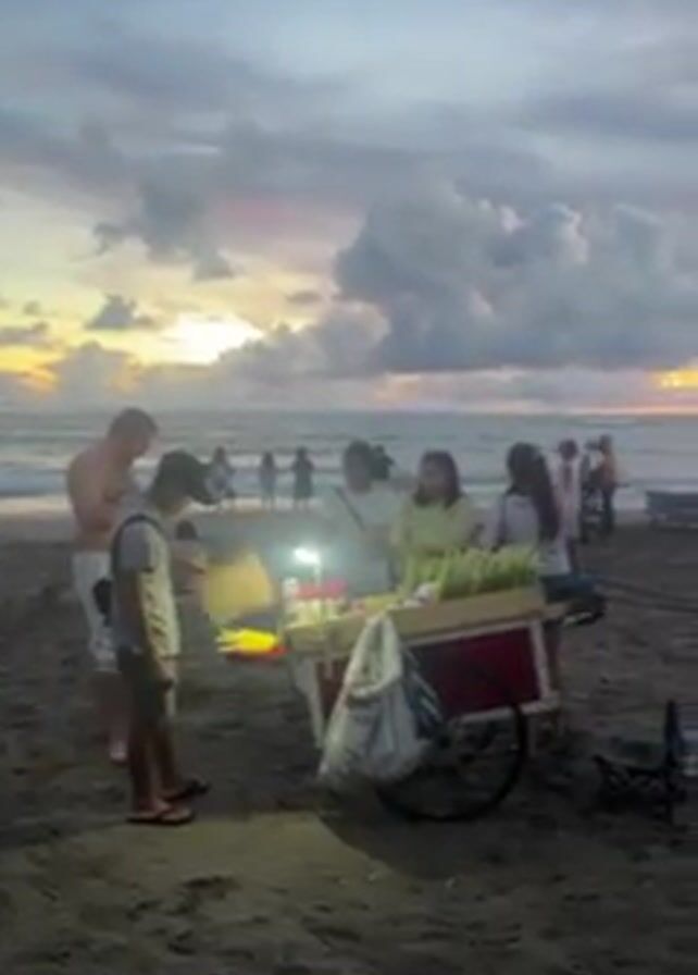 beach scene at dusk with a vendor selling corn on the cob from a pushcart