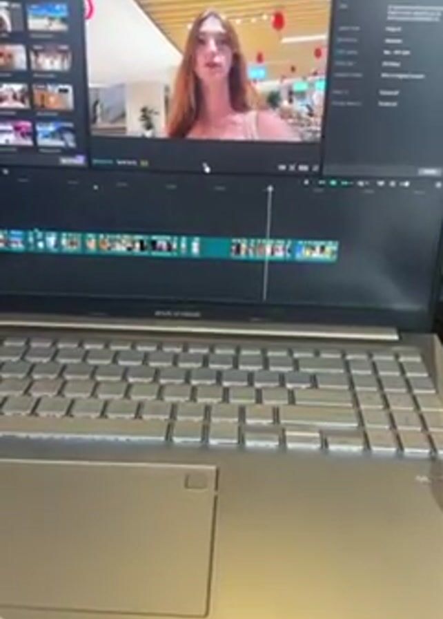 A laptop computer is open on a table, showing a woman in a white top on the screen within a video editing application. The video editing software has a timeline with many short video clips strung together. The woman on the screen is centered and looks toward the camera. There is what appears to be a book or stack of papers in the foreground, partially obscuring the bottom edge of the laptop. The laptop is an ASUS Vivobook.