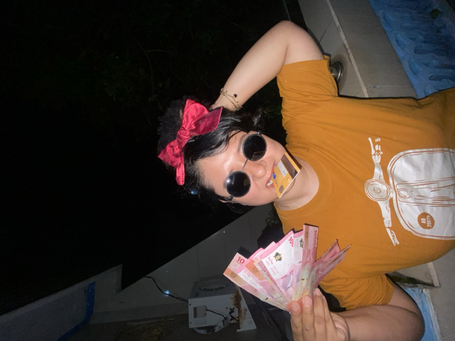 The image depicts one individual outdoors at night in Gelam, Indonesia. The person, wearing dark round sunglasses, a red bow in their dark hair, and an orange t-shirt featuring a white scooter graphic with "AB 70874" text, holds a fan of Indonesian Rupiah banknotes in their right hand, with visible 100,000 and 10,000 denominations. A yellow and white card is gripped between their teeth. Their left arm is raised, with the hand positioned near the back of their head, revealing a bracelet on the wrist. The background is primarily dark, with an outdoor utility unit mounted on a light-colored wall, partially marked with blue tape, visible to the left.