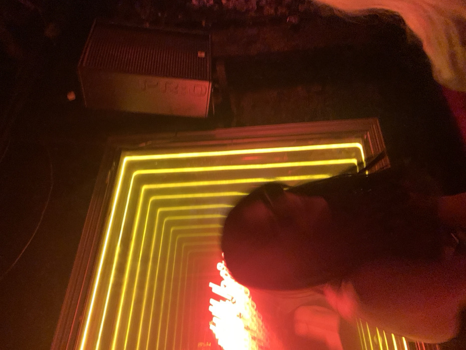 The image depicts an indoor scene within a nightlife venue, likely a bar or club, characterized by dim lighting and artificial illumination. In the left-center, a large rectangular light installation features multiple concentric yellow neon lines. Within this yellow framework, some red neon text or shapes are visible but unreadable due to blur and lighting. To the right, a dark, rectangular audio speaker with a gridded front panel, possibly bearing "JBL" branding, is mounted on a dark wall. The speaker is faintly illuminated by a red glow. Two individuals are partially visible in the foreground. On the left, a person with dark, shoulder-length hair and what appears to be sunglasses is seen from the chest up, facing right. Their features are obscured by shadow and motion blur. On the far right, a portion of a second person's head and shoulder is visible, characterized by light-colored, blurred hair. The overall environment suggests a contemporary social setting. The location is consistent with a modern bar or club in a nightlife-centric neighborhood of Mexico City, Mexico, such as Roma Norte or Condesa.