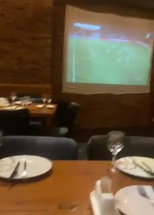 interior of a restaurant with a brick wall. Tables with place settings of plates, cutlery, and wine glasses are present. A projector displays a soccer game on a screen mounted on the wall. The ceiling has red lighting. The restaurant appears to be empty of customers.