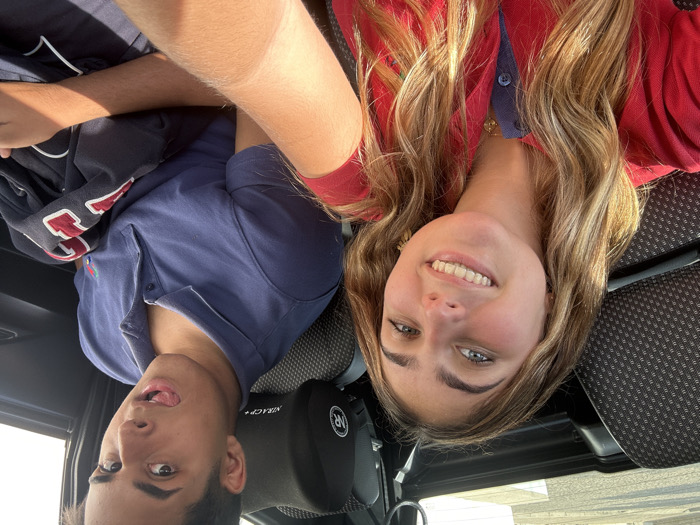 The image depicts two individuals seated inside a vehicle, located in Lordelo do Ouro e Massarelos, Portugal. In the left foreground, a female subject with long wavy blonde hair, heterochromatic blue-green eyes, and a fair complexion smiles directly at the camera. She wears a red polo shirt with a navy blue collar and placket, along with a gold-colored pendant necklace. To her right and slightly behind, a male subject with dark hair and a darker complexion is seated. He is looking towards the camera with his tongue slightly extended in a playful manner. He wears a navy blue polo shirt with a small embroidered emblem and holds a dark blue jacket or sweatshirt featuring white and red lettering. The vehicle's interior shows dark grey patterned fabric on the seats, and a headrest with a "NIRACP+" logo is visible behind the male subject. Bright natural light enters the vehicle from the upper right.