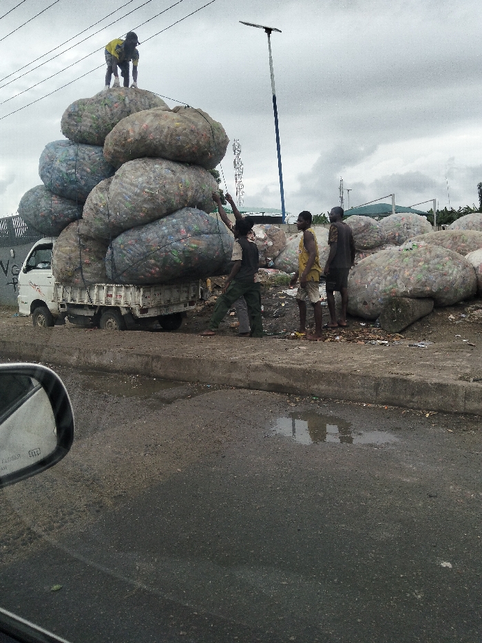 This image captures a roadside scene in Port-Harcourt, Nigeria, under an overcast sky, depicting a plastic bottle recycling operation