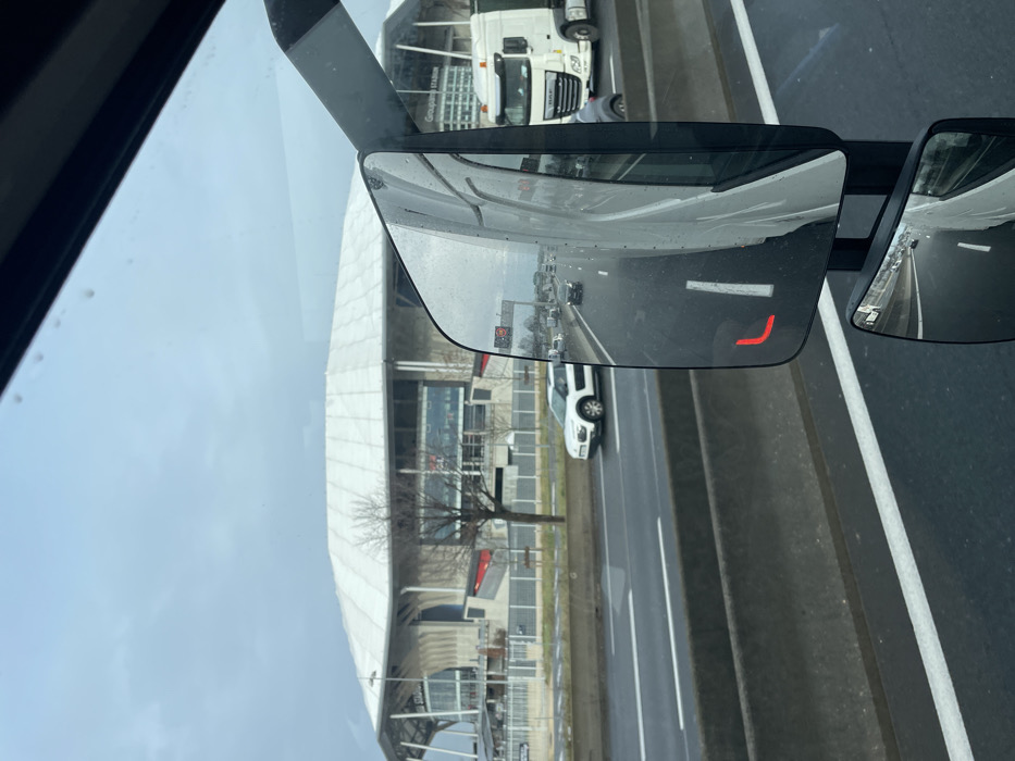 The image depicts an exterior scene from the perspective of a vehicle, likely a truck, showcasing a multi-lane highway and the Groupama Stadium in Décines-Charpieu, France, under an overcast sky. In the background, the Groupama Stadium stands prominently, characterized by its distinctive white, ridged roof and a multi-tiered, grey architectural facade. The stadium's name, "Groupama Stadium," is partially visible on its exterior. Several leafless trees are situated between the stadium grounds and the highway, separated by a fence. The midground features a dark asphalt highway with visible white lane markings. A concrete barrier separates the lanes of travel. Vehicles are present on the highway, including a white SUV (consistent with a Citroën C4 Cactus) in the lane adjacent to the barrier, traveling in the same direction as the viewpoint vehicle. The foreground is dominated by the interior framing of the viewpoint vehicle's window at the top and right. A large side mirror, characteristic of a commercial truck, occupies the mid-right portion of the image. This mirror reflects the highway behind the viewpoint vehicle, showing additional cars and a white DAF semi-truck. A smaller, secondary mirror is positioned below the main mirror, also reflecting the highway. A red, angular indicator light is visible on the surface of the main side mirror. The sky is uniformly grey and overcast, indicating a lack of direct sunlight.