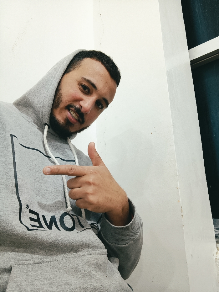 A man with dark hair and a beard is wearing a gray hoodie. He's smiling and pointing his finger towards the viewer. He is indoors, posing against a white wall near a window. The light and wall suggest the interior is simple.
