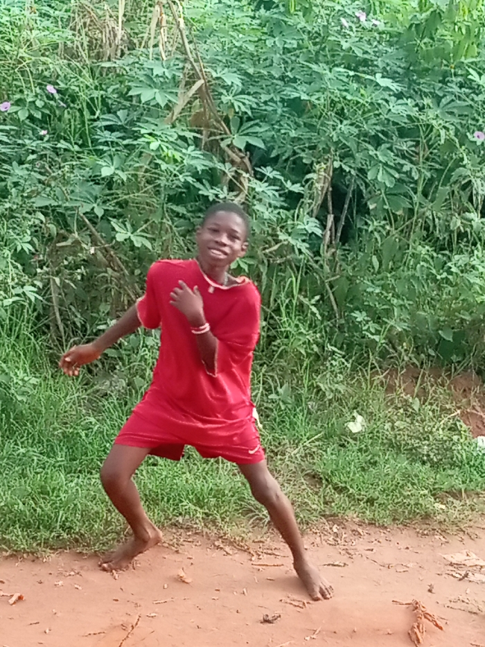 A young boy in red t-shirt and shorts stands barefoot on a dirt path. He's angled towards the camera, smiling, with one arm extended to the side. Lush green foliage fills the background. The boy appears to be in motion, perhaps dancing. The dirt path is reddish brown, and the overall impression is of a candid, outdoor scene.